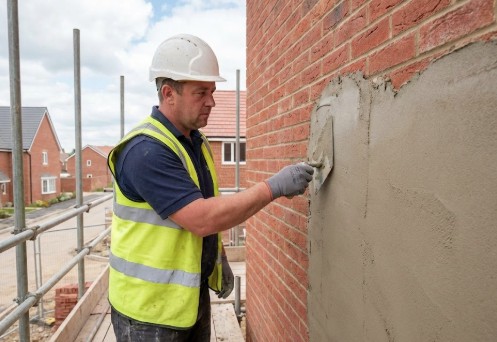 Revestimientos de Fachada: Enfoscados de mortero (como se ve en nuestras imágenes), monocapa, SATE (Aislamiento Térmico por el Exterior) y aplacados de piedra.